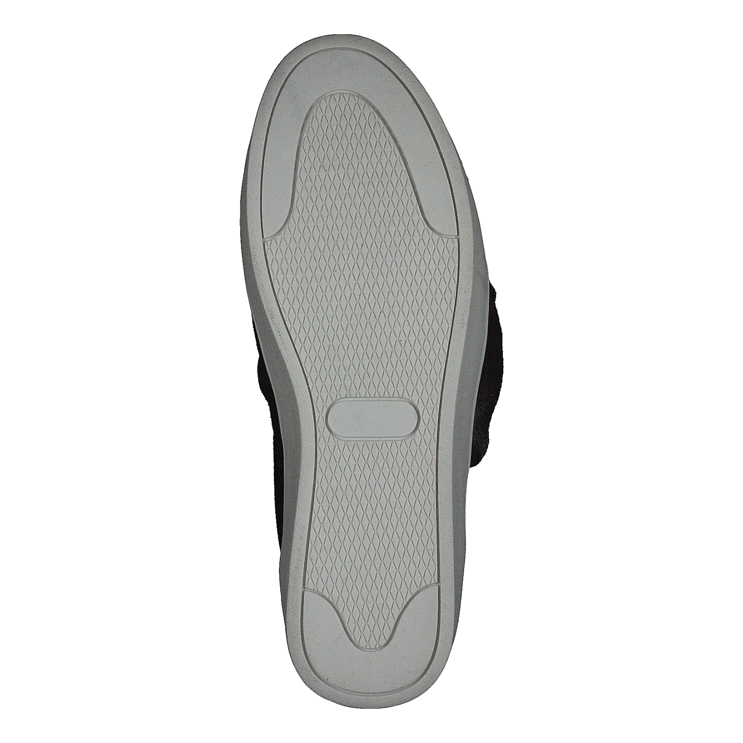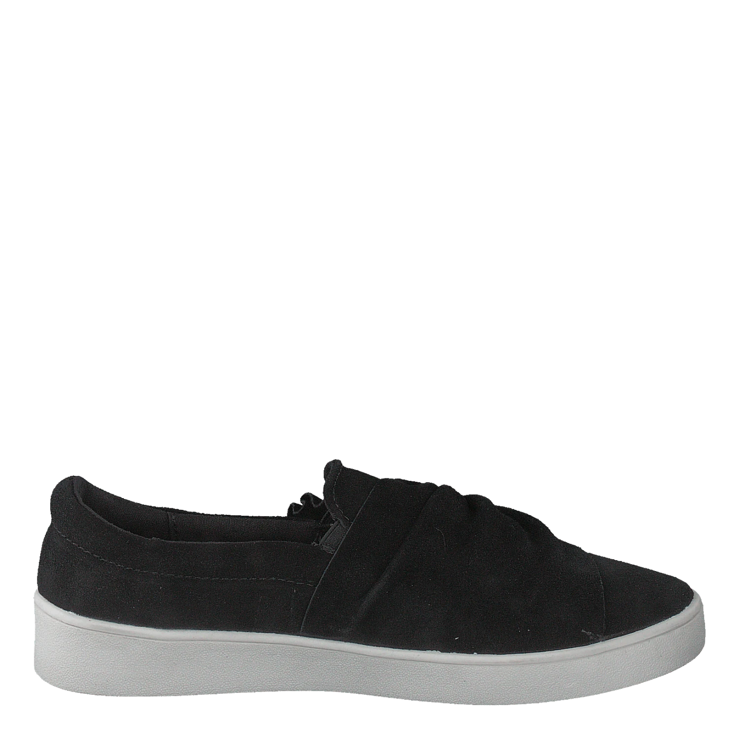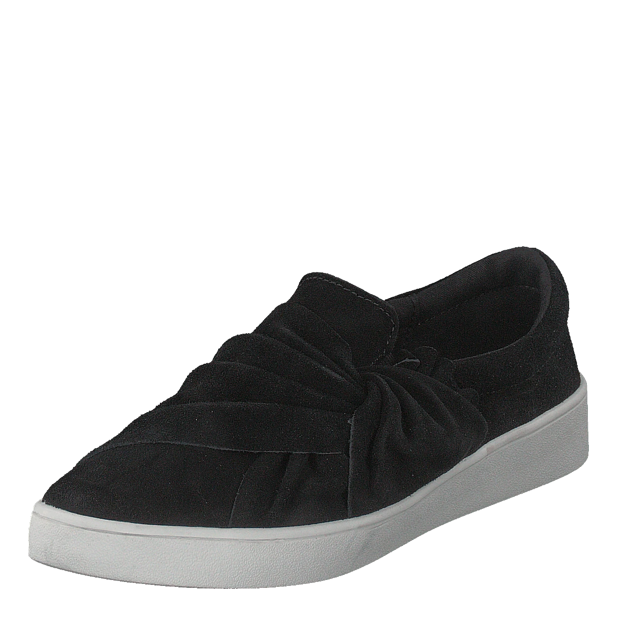 Snygg svart slip-onmodell i mocka med vit sula. Dekorativ knut på ovandelen.