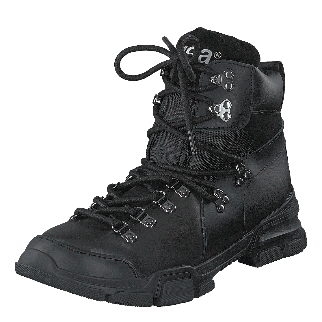 Tracking boots med rundad tå och fotled. Har en stadig och mönstrad yttersula i gummi. Tjock snörning fram med öljetter, som går hela vägen upp. Har svea logoband baktill och reflekterande svea logotyptryck på plösen i 3D-effekt.